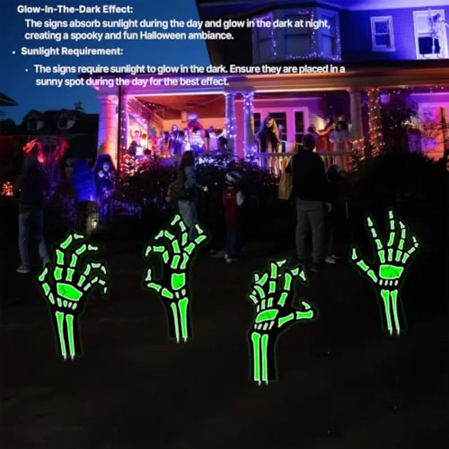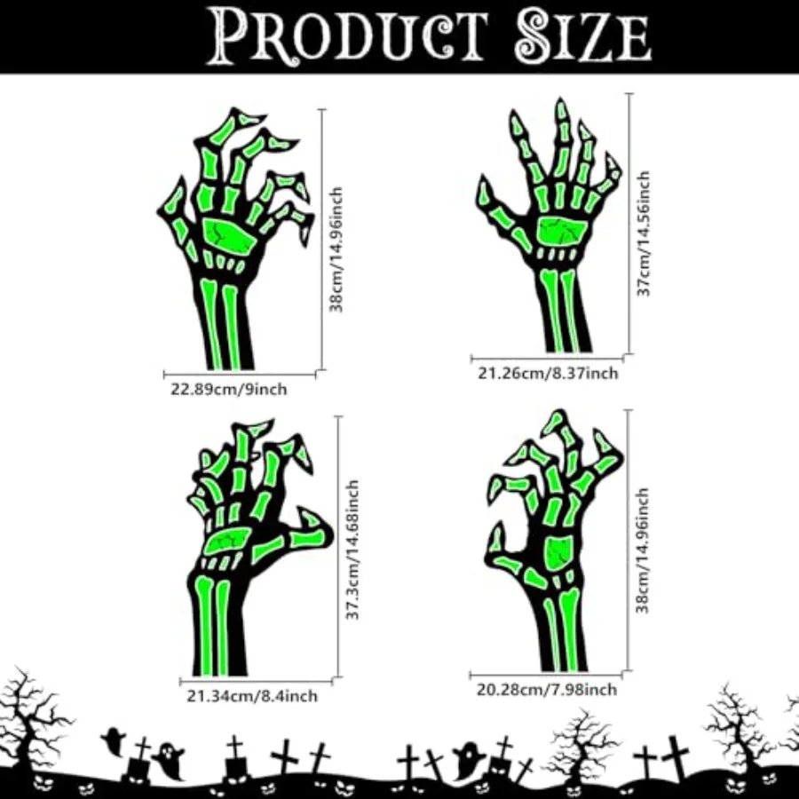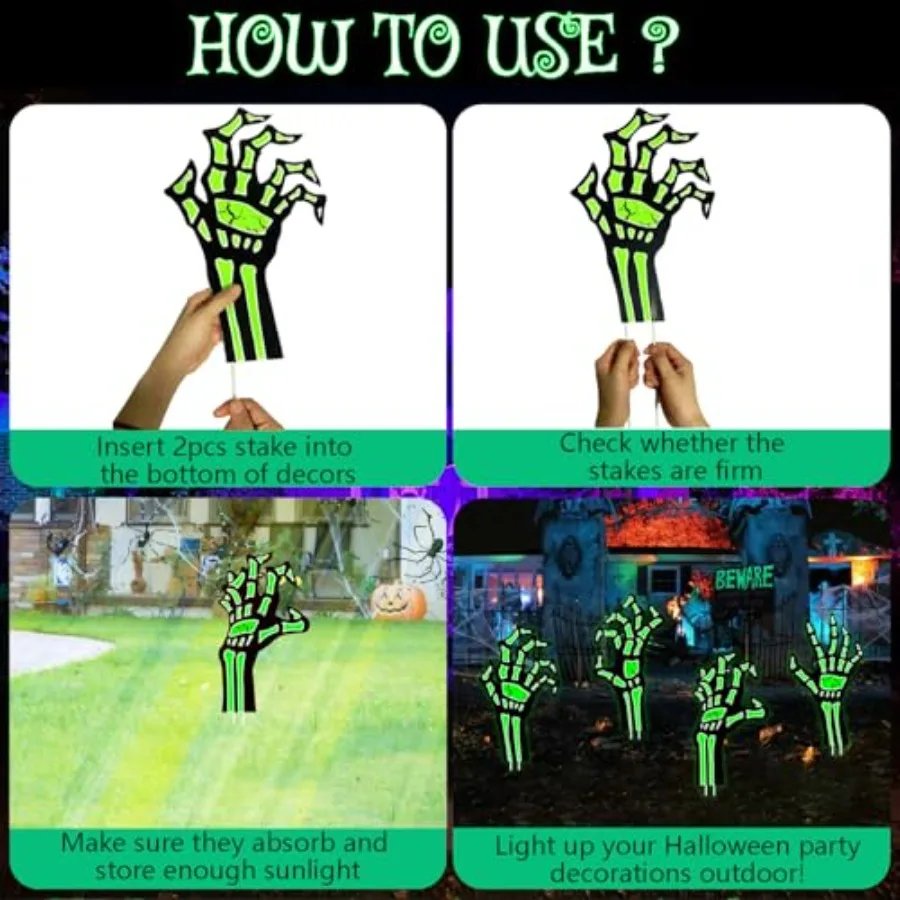 【COMPLETE HORROR SET】 Contains 4 uniquely posed glowing hands with integrated mounting sticks. Arrives ready-to-display for both indoor haunted houses and outdoor Halloween party decor.